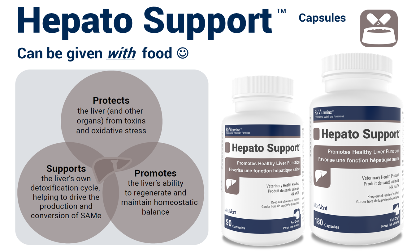 Complete liver support that's easy to give. Hepato Support features a premium milk thistle extract, complexed with powerful anti-oxidants, co-factors, and a suite of key B-vitamins. It protects the liver from toxins and oxidative stress while promoting healthy liver function and supporting the liver's own detoxification cycle. And unlike most liver supplements, Hepato Support can be given with food, which makes administration a whole lot easier!