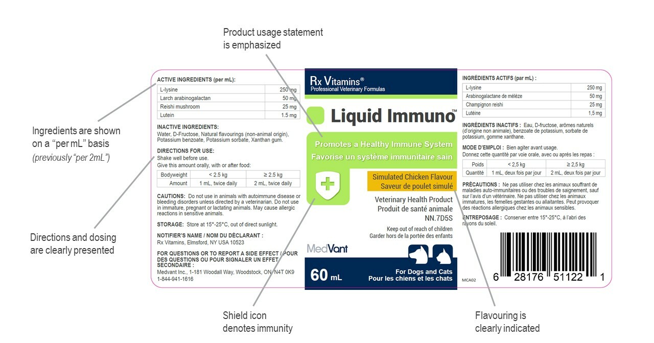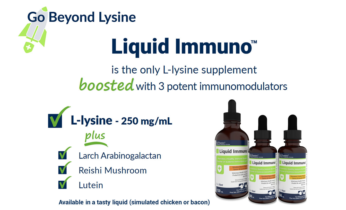 And clients will love that Liquid Immuno is super tasty and easy to give. It can be administered directly into the patient’s mouth or mixed into wet food. Available in simulated chicken or bacon flavour, with a graduated dropper for precise dosing.