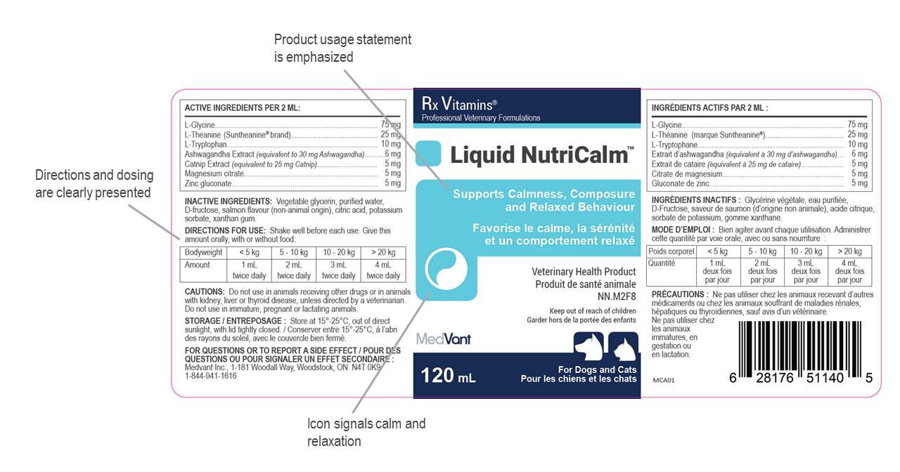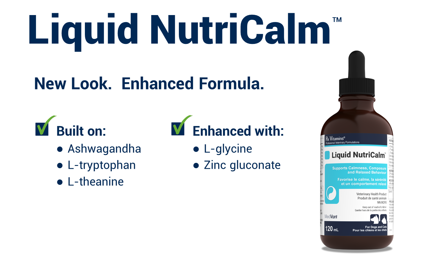 NOTE: Liquid NutriCalm is the liquid option, whereas NutriCalm for Dogs comes in a capsule format. The capsule format delivers similar levels of most active ingredients with a higher level of L-tryptophan and with Valerian still included. Both products (liquid or capsule) feature Ashwagandha, L-theanine and L-tryptophan which are the key drivers for supporting calmness, composure and relaxed behaviour. Liquid NutriCalm is recommended for smaller patients and fussy eaters when compliance is a key consideration. NutriCalm for Dogs is recommended for larger patients that require additional support.