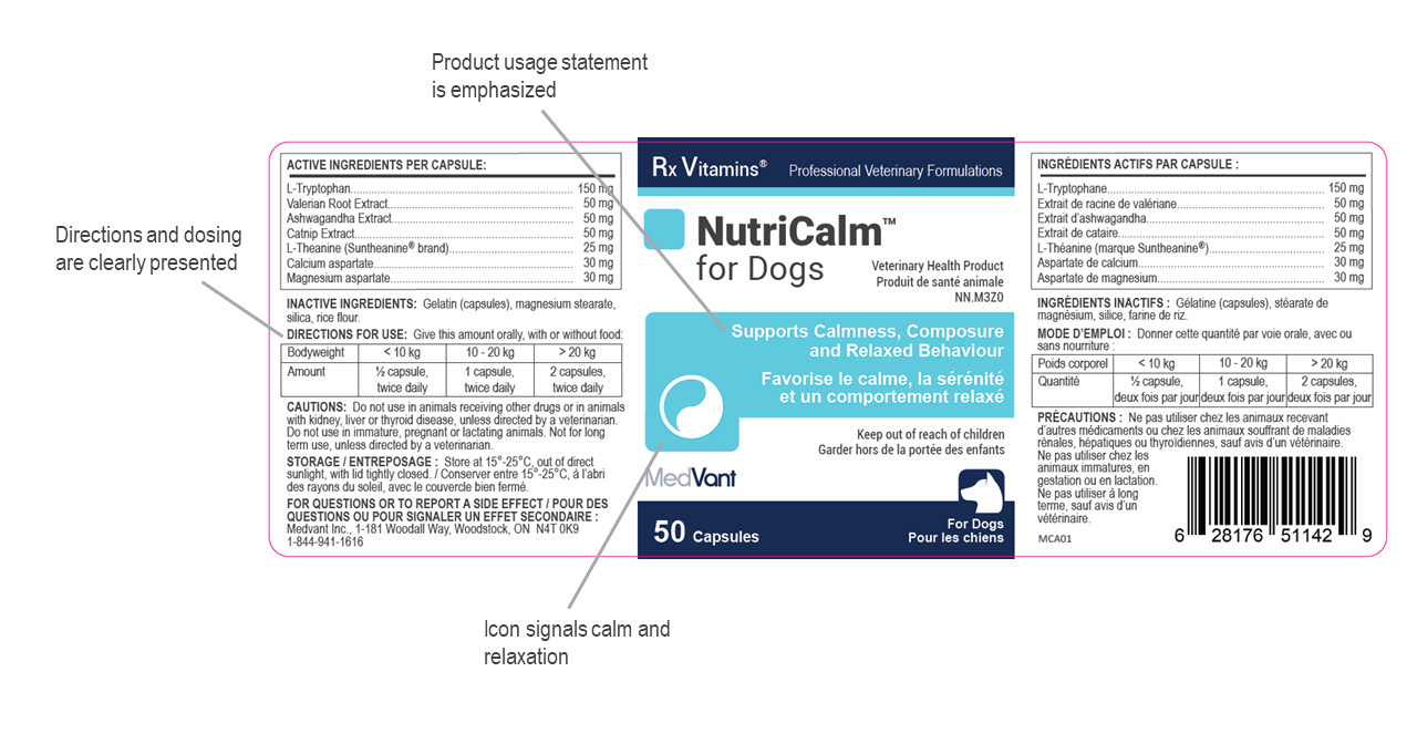 NutriCalm for Dogs is available in capsule format, delivering potent active ingredients with minimal fillers. NOTE: a related product, Liquid NutriCalm is available as a palatable liquid with a slightly different formulation. The liquid formula is designed for smaller dogs, cats and fussy eaters where compliance is more challenging.