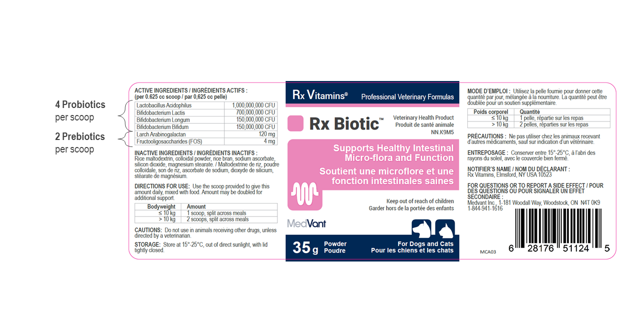 Rx Biotic is designed for everyday use. It supports healthy intestinal micro-flora and normal bowel function in dogs and cats. One small scoop delivers a big impact with over 2 billion viable cells of 4 major probiotic strains, plus 2 premium sources of prebiotics. When it comes to daily support, Rx Biotic contains all of what a pet needs and none of what they don't.