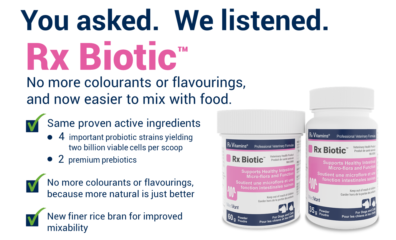 Many veterinarians (and their clients) now prefer less colourants and flavourings. So we removed them. Rx Biotic is now a natural tan colour (previously a slight orange colour) while still retaining its natural palatability. It is also easier to mix with food thanks to a new finer source of rice bran.