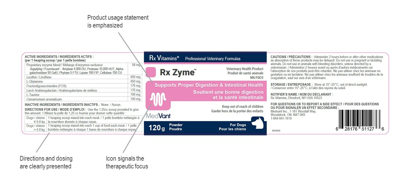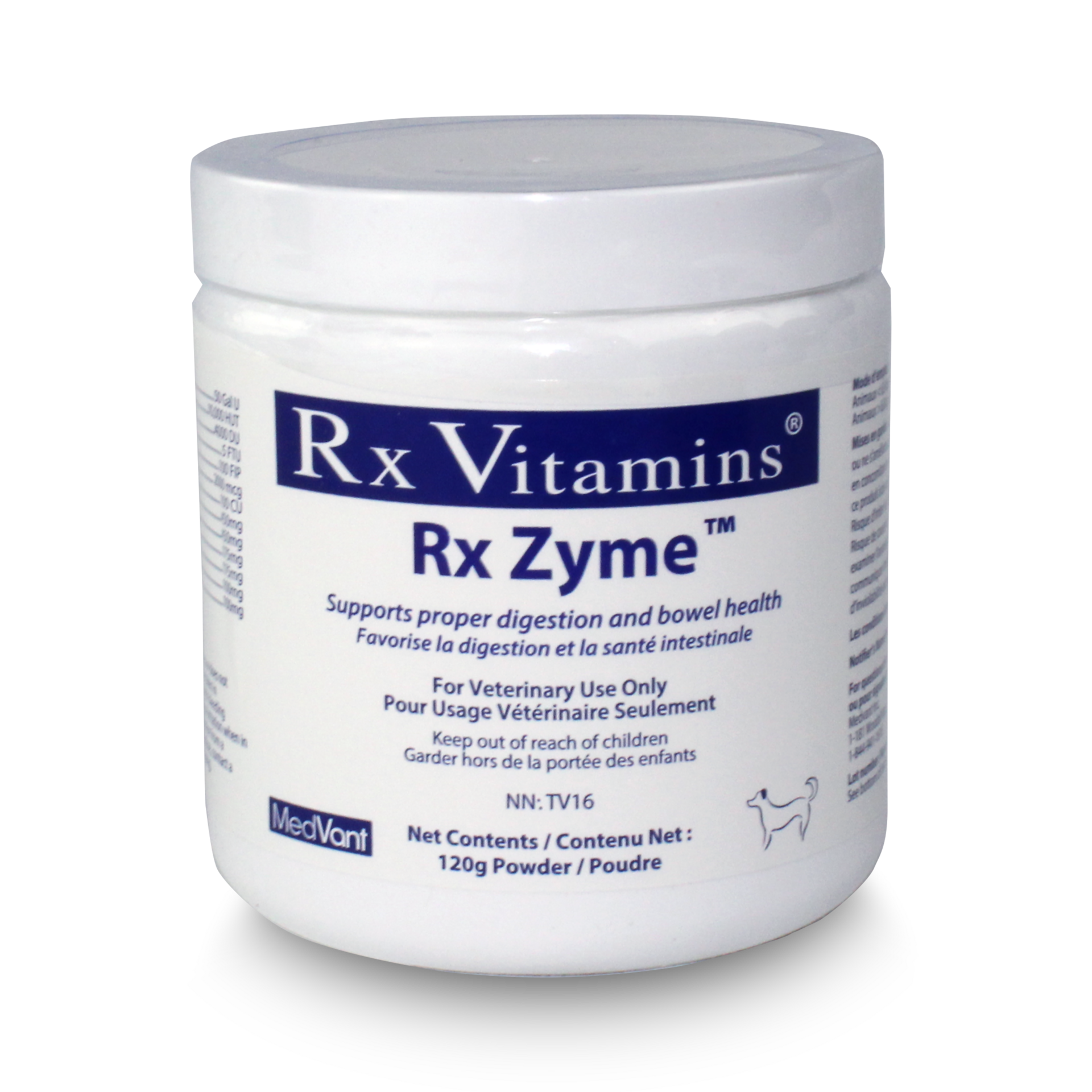 Rx Zyme is ideal for dogs needing additional digestive support. The high-potency enzymes help breakdown protein, fats and carbohydrates, while the nutraceuticals and prebiotics promote proper absorption of nutrients and overall intestinal health. The powder is tasty and can be mixed easily with each meal.